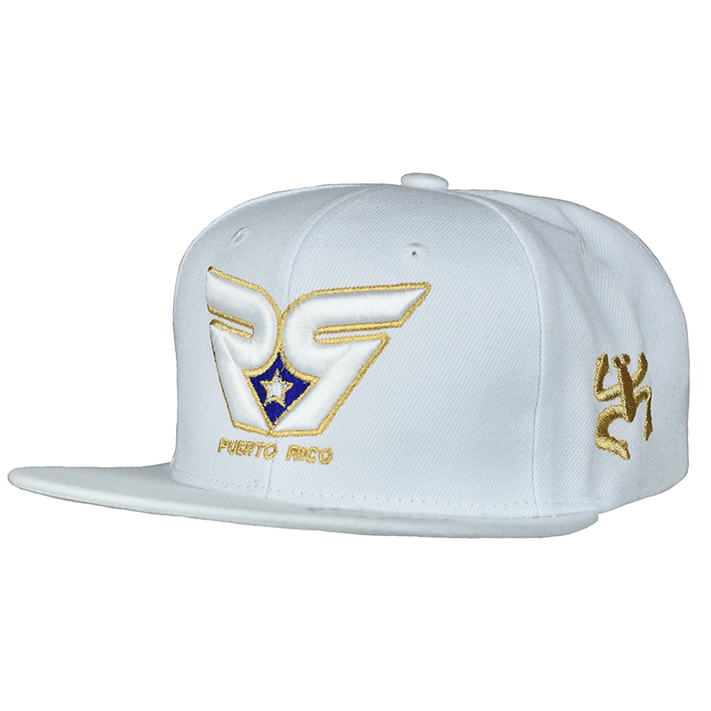 • Front: Large white “PR” embroidery with gold borders and Puerto Rican flag star in the center